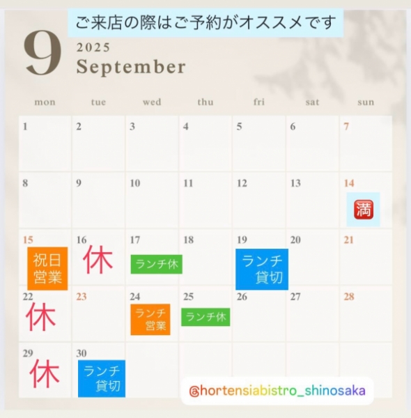 9月後半も貸切があったり振替定休日があったり。不規則な営業となっておりますのでご来店の際はご予約が...