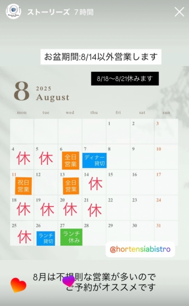 8月の予定になります。もう8月‼️早いもんです。お盆休みは営業します。その後に少しお休みいただきます...