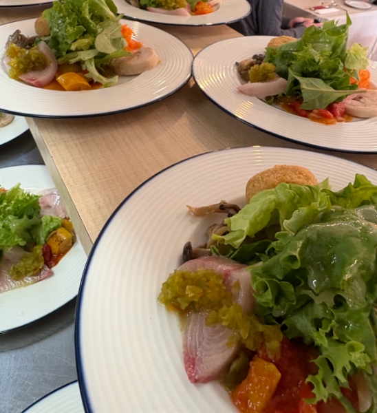 写真は、瑞々しいリーフサラダに魚介のマリネ、彩り野菜、香り立つソースを合わせた前菜の一皿。テーブルに同じ皿が並ぶ瞬間は、これから始まるコースへの期待が高まります。東三国駅から徒歩約3分・新大阪駅から徒歩10分のHortensia Bistro(オルタンシア ビストロ)では、フランスで研鑽を積んだシェフが「上質をカジュアルに」仕立てるフレンチを、落ち着いた空間でお楽しみいただけます。