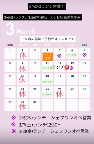 テレビ収録や子供の行事等、ランチ営業が不規則になっています。